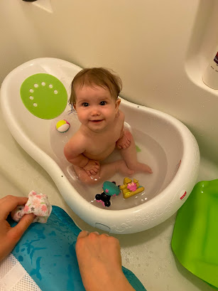 So now, daddy is pretty much out of the bath routine. In the sink, we were both able to stand there and give her a bath. There's just not enough room for us in her bathroom by the tub, so it's a one person job... which is honestly tough. I was the soaper and Cody was the rinser before. It's hard to do it on my own without him.