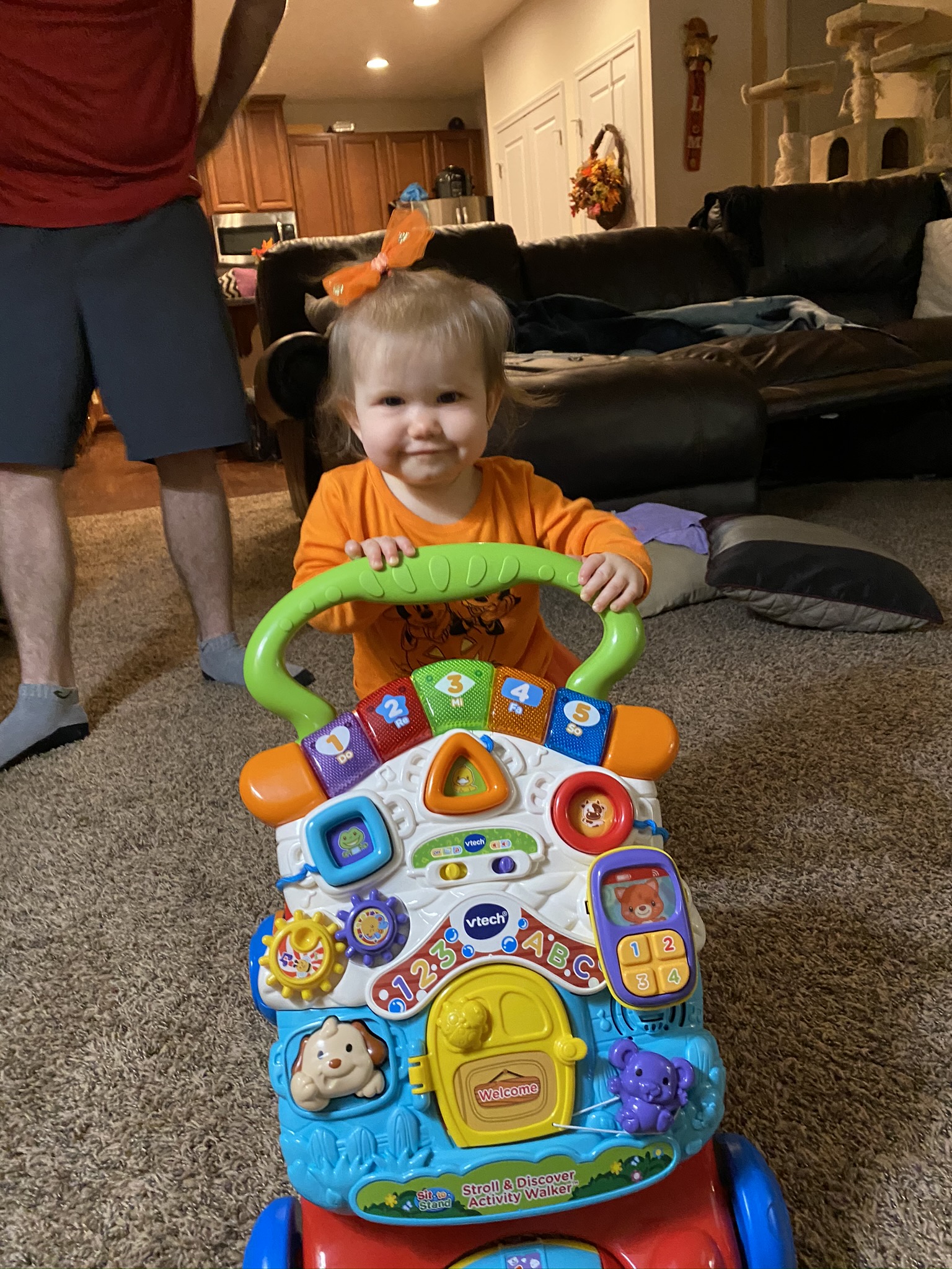 Kayla also started to walk a little bit on the furniture and with her little walker this month.